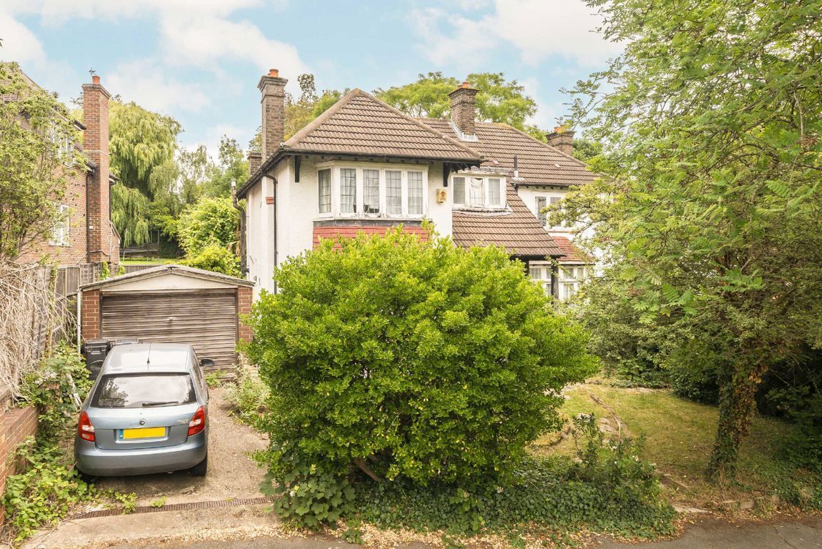 A detached, double-fronted four-bedroom house requiring modernisation, set on a wider-than-average plot with a separate garage and additional driveway.